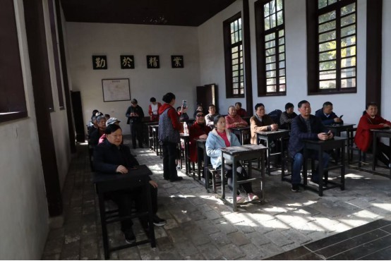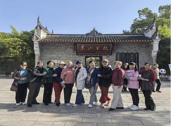接着,探访书院文脉,领略湖光山色,老党员们来到了素有“红色摇篮”美誉的湘乡东山学校(其前身为东山书院)。这里曾是毛泽东、陈赓、谭政等老一辈革命家求学的地方。漫步于古朴典雅的书院廊庑间,感受着浓厚的历史文化氛围,大家仿佛看到了当年青年学子们探求救国真理、立志改造中国的身影。书院“公诚勤俭”的校训和培养经世致用人才的办学理念,让老党员们对湖湘文化底蕴及其对近代中国革命的深远影响有了更深刻的理解。